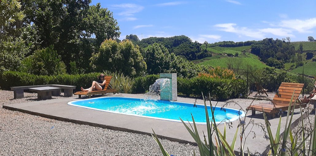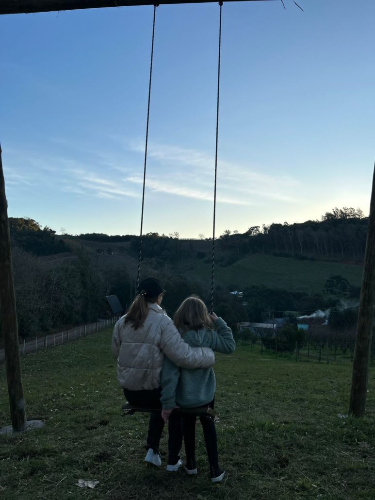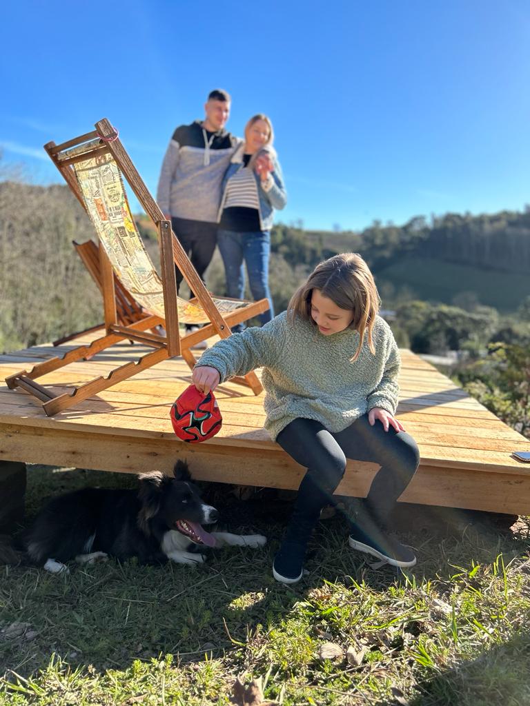 Na área externa do chalé com deck, vista para o pomar, campo dos animais, árvores e firepit.