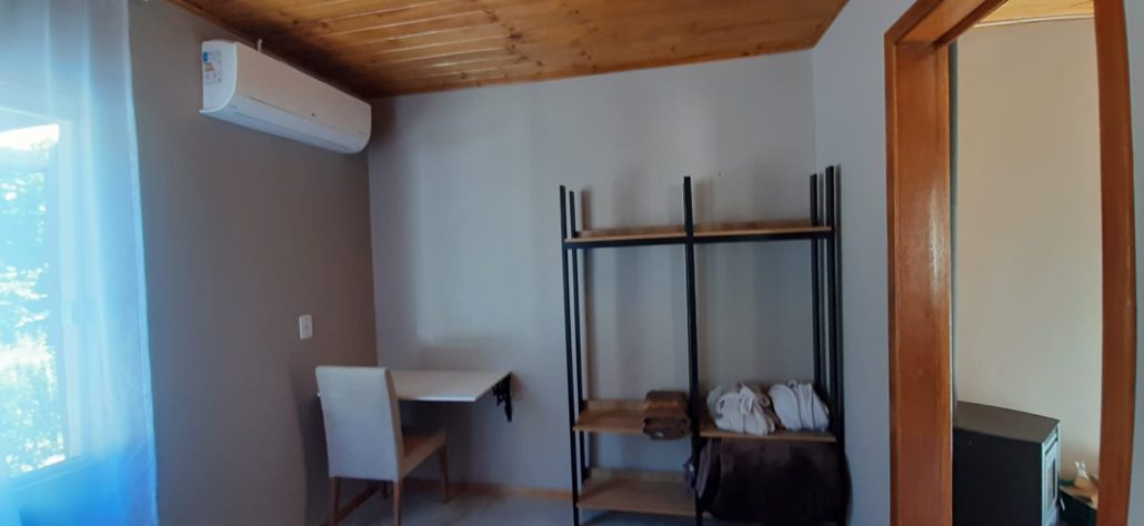 A casa acomoda até 3 adultos do mesmo grupo, com 1 quarto com cama queen size com ar condicionado, mesa de trabalho, sala com sofá para uma pessoa.